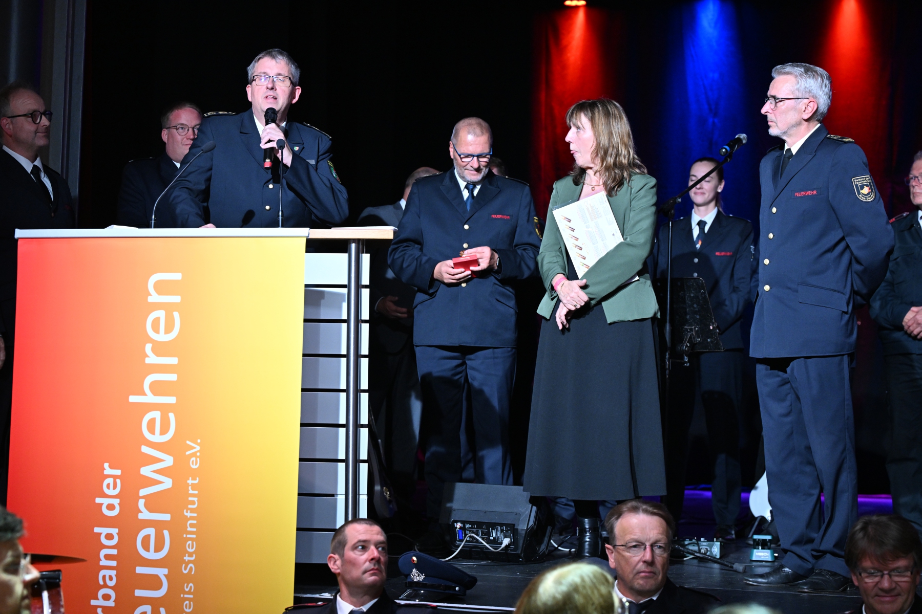 Eine besondere Ehrung erlebte Manfred Kleine Niesse – nach seinen Grußworten: Er wurde von seinem Stellvertreter Guido Roters mit dem Feuerwehr-Ehrenkreuz in Gold des Deutschen Feuerwehrverbandes überrascht. Mit dieser hohen Ehrung würdigte der Verband sein langjähriges, herausragendes Engagement und seine Verdienste um die Feuerwehren im Kreis Steinfurt. Sichtlich bewegt nahm Kleine Niesse die Auszeichnung entgegen – ein Moment, der von großem Applaus und Anerkennung der anwesenden Gäste begleitet wurde. -fm-