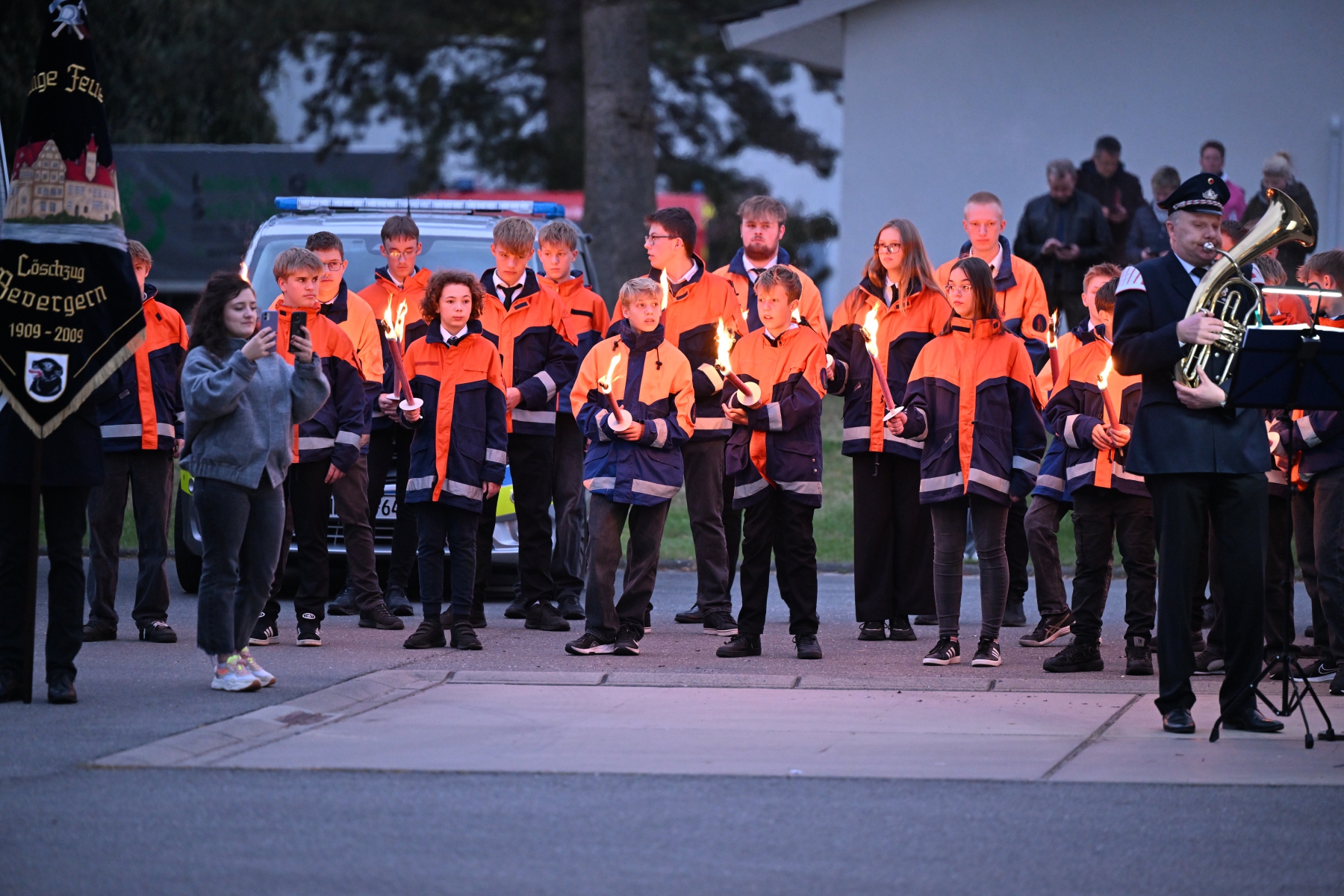 Der Fackelzug setzte sich um 19.00 Uhr vom Burgplatz Bevergern zum Feuerwehrgerätehaus an der Rodder Straße in Bewegung. Hier wartete bereits eine Abordnung aus Politik, Verwaltung und befreundeter Feuerwehren. Eine besondere Auszeichnung hatte der Bezirksbrandmeister, Oliver Wegener mitgebracht. Er zeichnete Wernsmann mit dem Ehrenkreuz des Deutschen Feuerwehrverbandes in Silber aus.